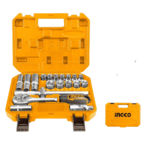 Material:CR-V(50BV30) heat treated Brand : Ingco Packed by BMC Include: 1pcs 1/2″ DR. Ratchet handle 12pcs 1/2″ DR. Sockets: 10,11,12,13,14,15,16,17,18,19,22,24mm 1pcs 1/2″ DR. Spark Plug Socket:16mm 1pcs 1/2″ DR. Universal joint 1pcs 1/2″ DR. Extension bar:10″ (250mm) 1pcs 1/2″ DR. Three way joint 3pcs 1/2″ DR. Deep hexagonal sockets: 13, 17, 19mm