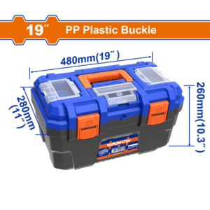 19″ Plastic Tool Box Size :480mm(19″”)x280mm(11″”)x260mm(10.3″”) Material: PP PP plastic buckle Max Load : 18KG High-strength Handle Upper cover with three storage areas Upper cover with scale function Contains 1Pcs plastic tray Packed by label