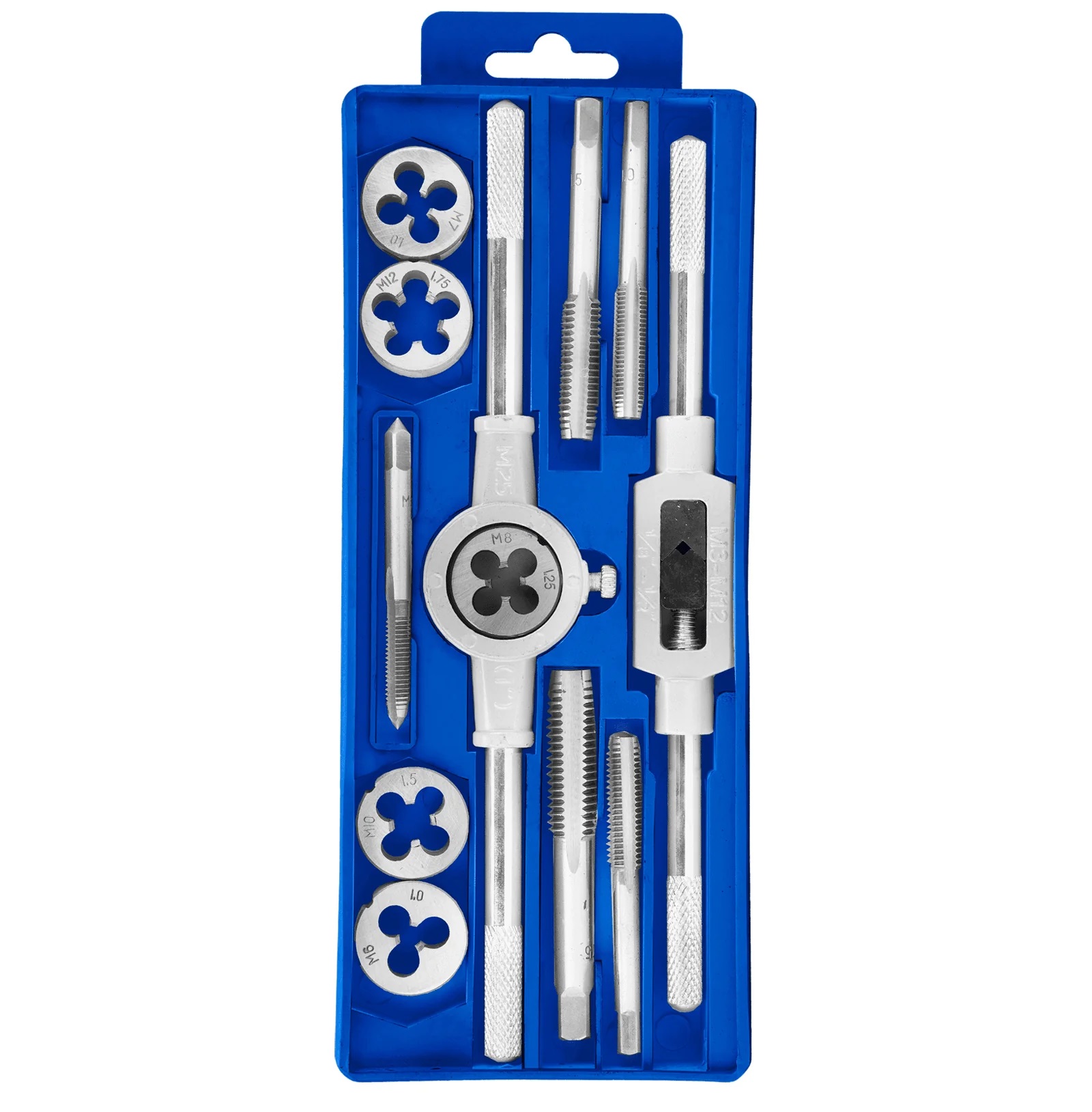 - 5pcs round die: M5×0.8, M6×1.0, M8×1.25, M10×1.5, M12×1.75