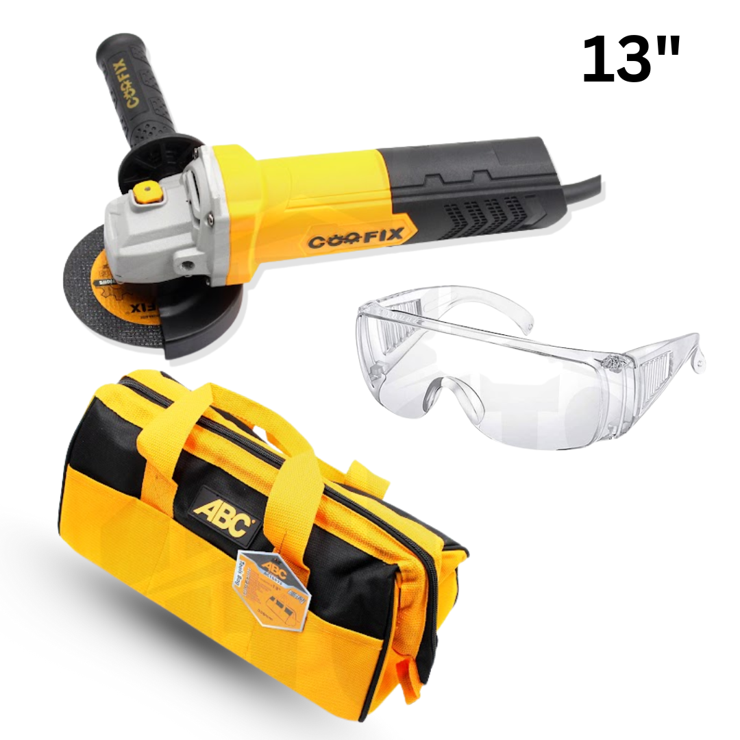 Angle Grinder 100mm With 5 Pcs Cutting Disc CF-AG010+Tools Bag 13″ ABC and Safety Clear Goggles ABC – ABC0087