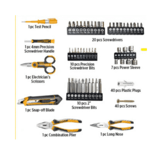 1pc 2.0Ah Battery Pack 1pc Charger 1pc x SL5.5×100 screwdriver 1pc x PH1x100 screwdriver 1Pc x 1/4’’ 100mm Magnetic Shank 4pcs x wood drill bits 4,5,6,8mm 1pc x 7″ combination pliers 1pc x 6″ long nose pliers 1pc x snap-off blade knife 5pcs x twist drill bits 2,3,4,5,6mm 1pc x 8oz claw hammer 1pc x mini hacksaw frame 1pc x 8″ adjustable wrench 5pcs x masonry drill bits 4,5,6,8,10mm 1pc x 3m steel measuring tape 1Pcs 5.5’’ Electrician’s scissors 1pc x test pencil 1pc x 4mm precision screwdriver handle 1pc x magnetic bits holder 40pcs x screws(22pcs*ST3.5,10pcs*ST4,8pcs*ST5) 40pcs x plastic plugs(22pcs*5mm,10pcs*6mm,8pcs*8mm) 8pcs x Hex key: 1.5,2,2.5,3,4,5,5.5,6mm 7pcs x power sleeve (Cr-V): 5,6,7,8,9,10,11mm 10Pcs 2″ screwdriver bits:SL4,SL5,SL6,PH1,PH2,PH3,T10,T15,T20,T30 10pcs x precision screwdriver bits: SL1.5,SL2,SL3,PH000,PH00,PH0,T6,T8,H1.5,H2.5 ″ electrician’s scissors 20pcs screwdriver bits SL3,SL4,SL5,SL6,PH0,PH1,PH2,PH3,PZ0,PZ1,PZ2,PZ3,T10,T15,T20,T30,H3,H4,H5,H6