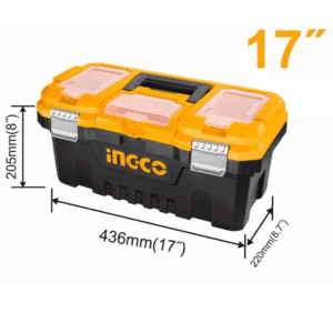 Ingco PBX2002 Plastic Tool Box 20″ 20″ Plastic Tool Box Size : 508mm(20″)*296mm(11.7″)*261mm(10.3″) Material: PP weight:2190g Max Load : 20KG Metal buckle High-strength Handle Upper cover with three storage areas Upper cover with scale function Contains 1Pcs plastic tray